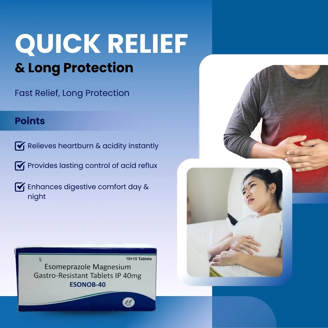 ESONOB 40 is a proton pump inhibitor (PPI) containing Esomeprazole 40 mg, normally used to lessen more stomach acid and provide relief from acid-associated troubles. It is broadly prescribed for the remedy of gastroesophageal reflux sickness (GERD), a state of affairs in which stomach acid frequently flows again into the esophagus inflicting heartburn and inflammation. By decreasing acid production, it facilitates in recovery the esophageal lining and stopping similarly damage.