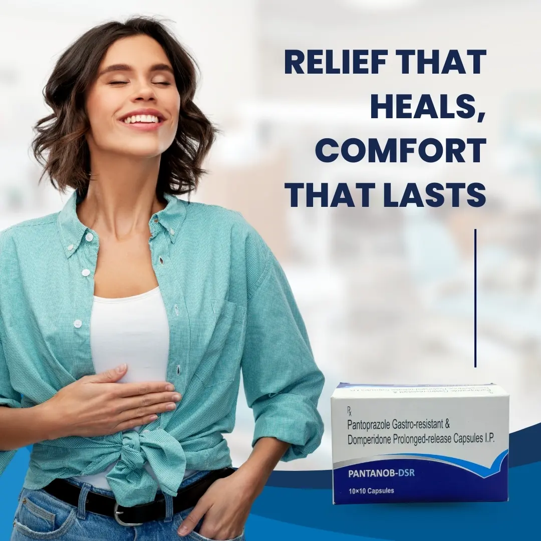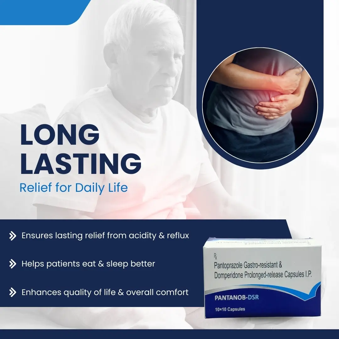 PANTANOB-DSR from Noble Pharmaceuticals combines a proton pump inhibitor and a prokinetic agent to relieve acid reflux and gastric discomfort. Moreover, it effectively reduces belly acid and enhances gastric motility. Consequently, PANTANOB-DSR supports faster symptom alleviation and improved digestive fitness, ensuring better comfort and usual gastrointestinal proper-being.